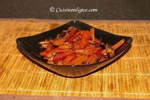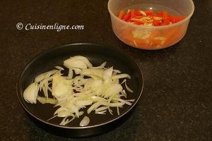 Pour débuter cette recette, commencez par éplucher puis couper finement vos oignons. Pelez les carottes et coupez les en petits bâtonnets.