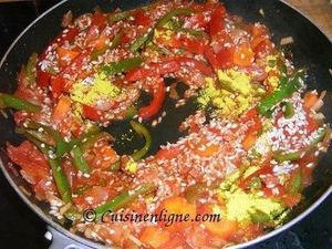 Ajoutez les tomates coupées en petits morceaux, le riz rond et le safran. Remuez l'ensemble et portez à feu vif. Laissez cuire pendant environ 5 minutes de minutes.
